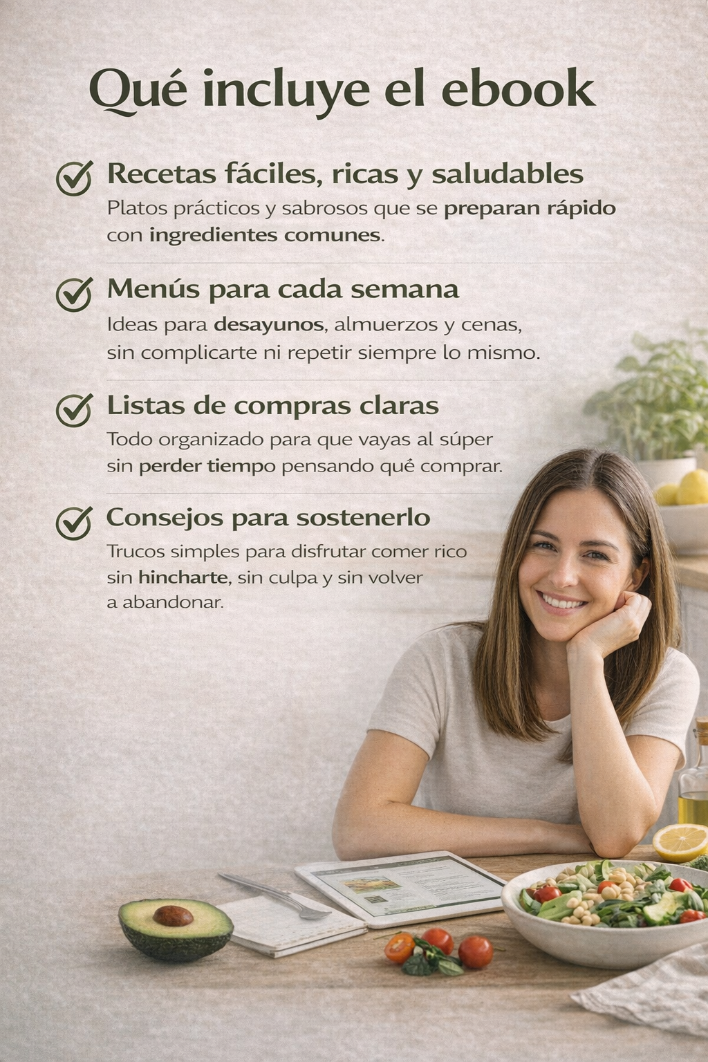 Guías de principios de alimentación consciente, recetas 100% naturales, listas de compra, sustituciones y planes sugeridos.